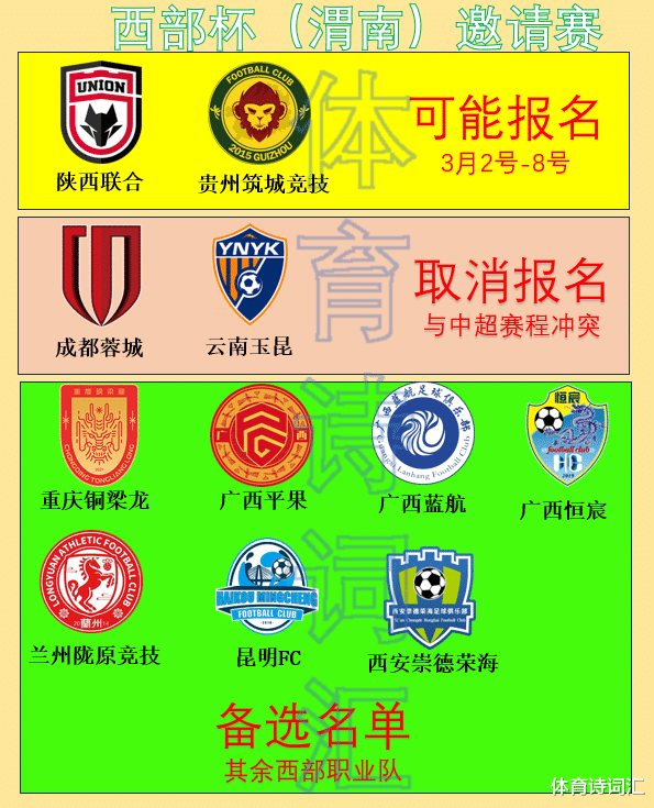 11支工作队在西部络续能干,于是在1月初,一场名为“西部杯”的足球友谊赛倏得传出来,许多西部球迷王人在期待着赛事的到来。西部杯原计算是于本年的2月12号到16号进行,并邀请了四个西部最强队参赛,包括中超的成王人蓉城、云南玉昆,以及中甲的重庆铜梁龙、陕西筹划。