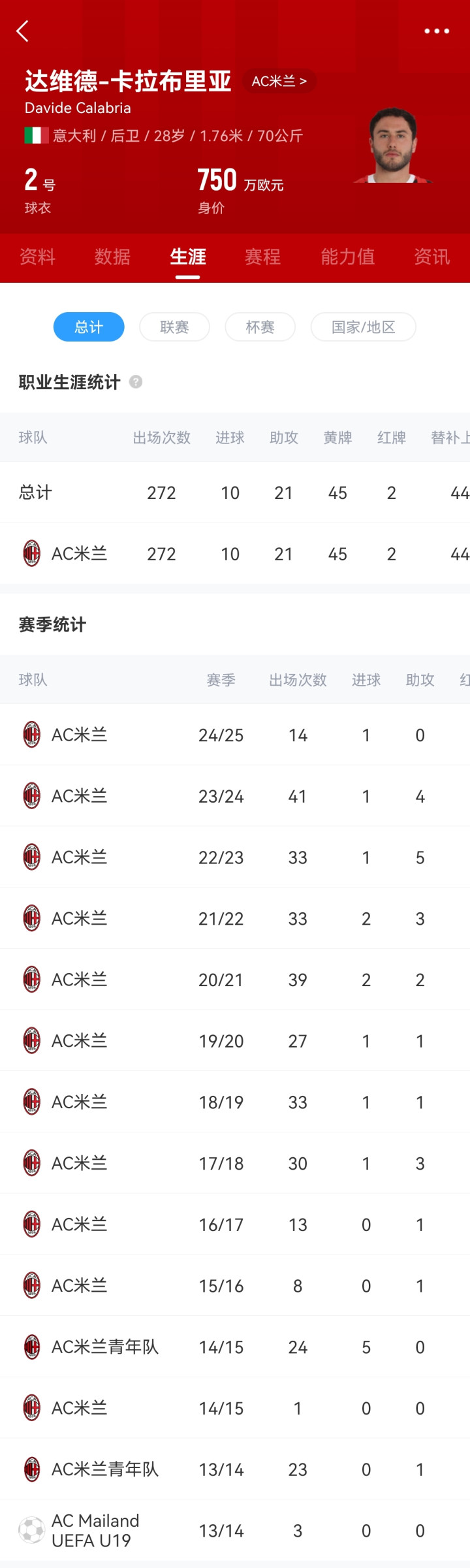 卡拉布里亚11岁加盟米兰,于今已有17年事月。